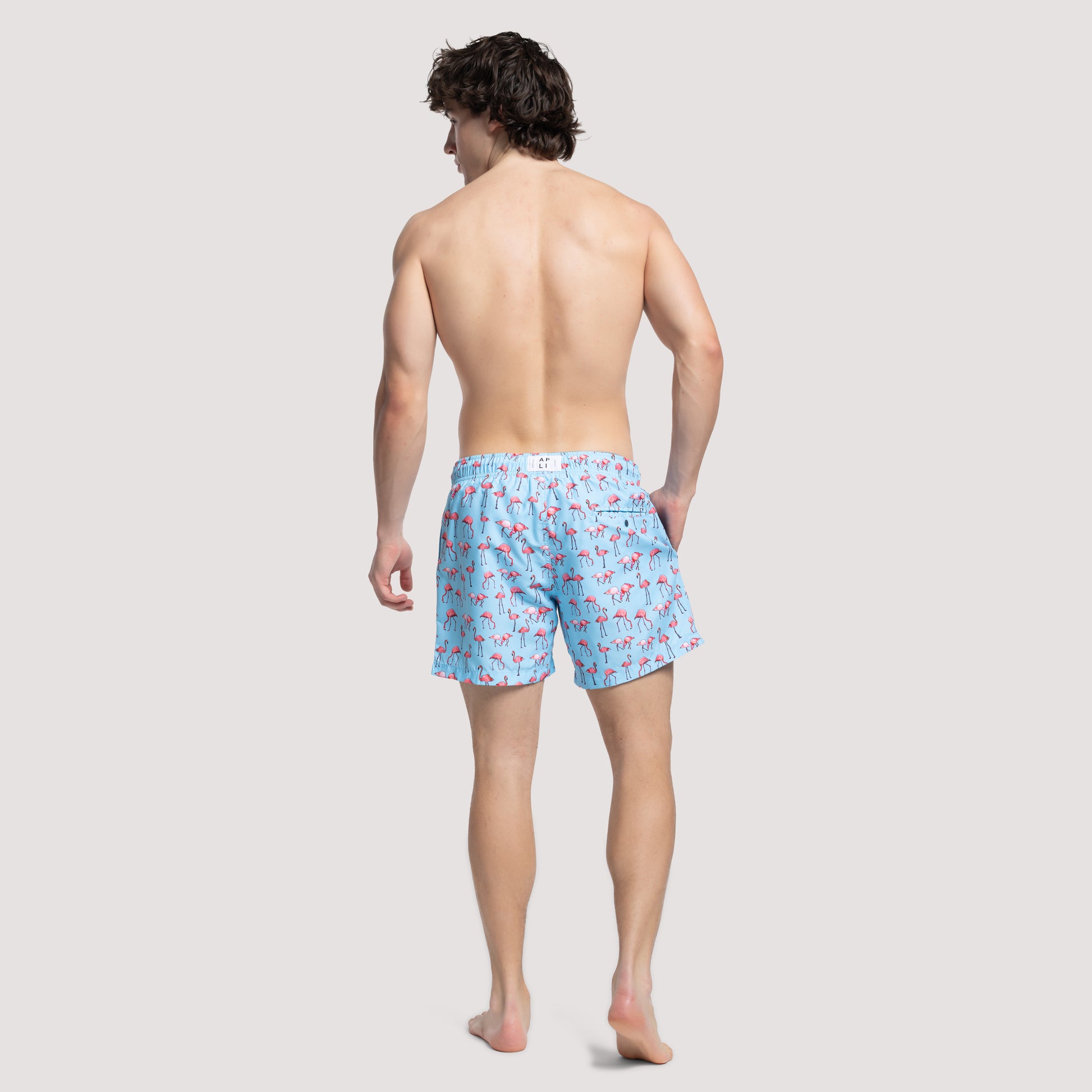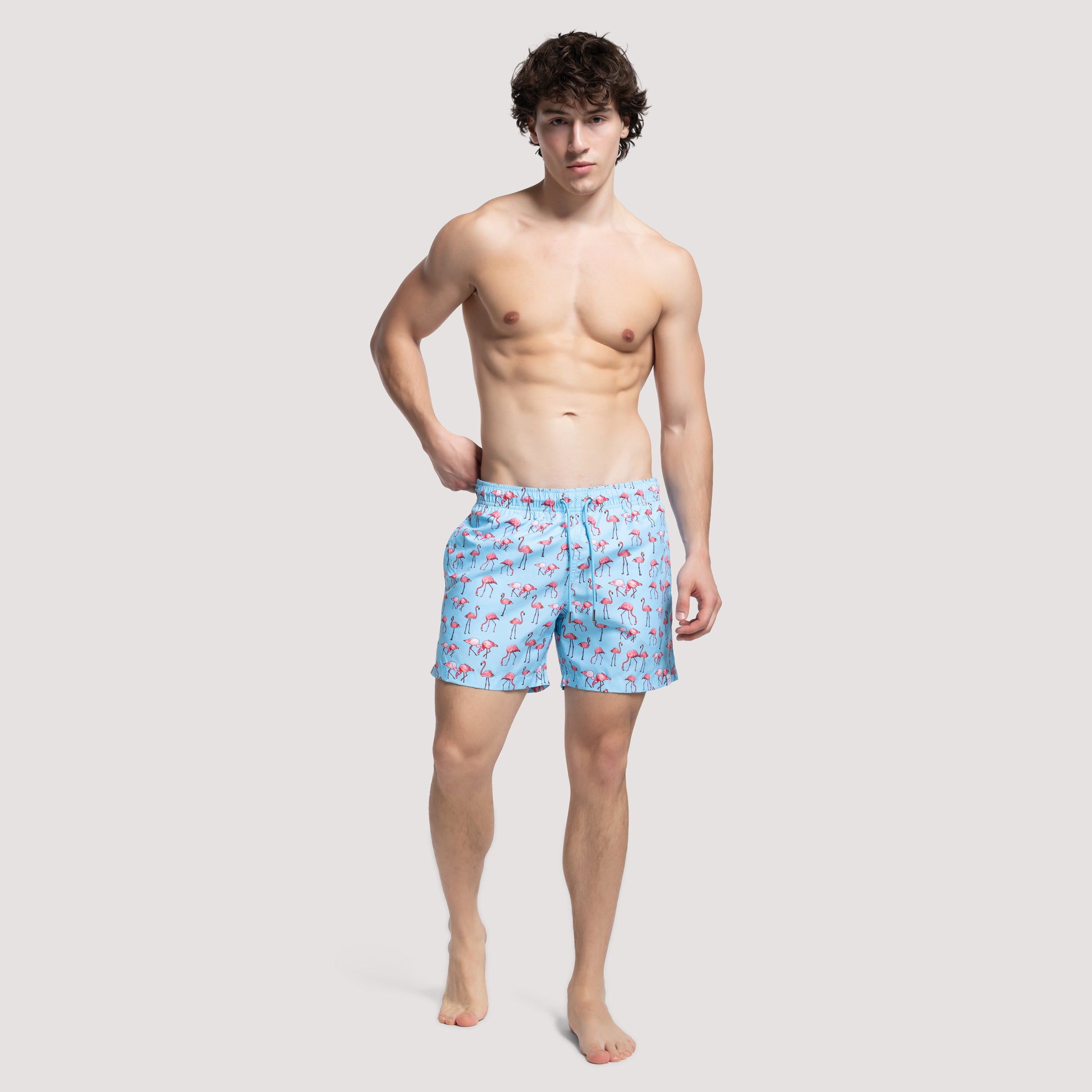 Blue swim shorts with flamingo prints. Sustainable material, regular fit, elastic waistband with drawstrings, and 3 pockets. Soft mesh lining ensures a comfortable fit. Small logo on the left leg and medium logo on the back. Made from 100% recycled polyester (PET plastic bottles). Model is 185cm (6'1") and is wearing size M.