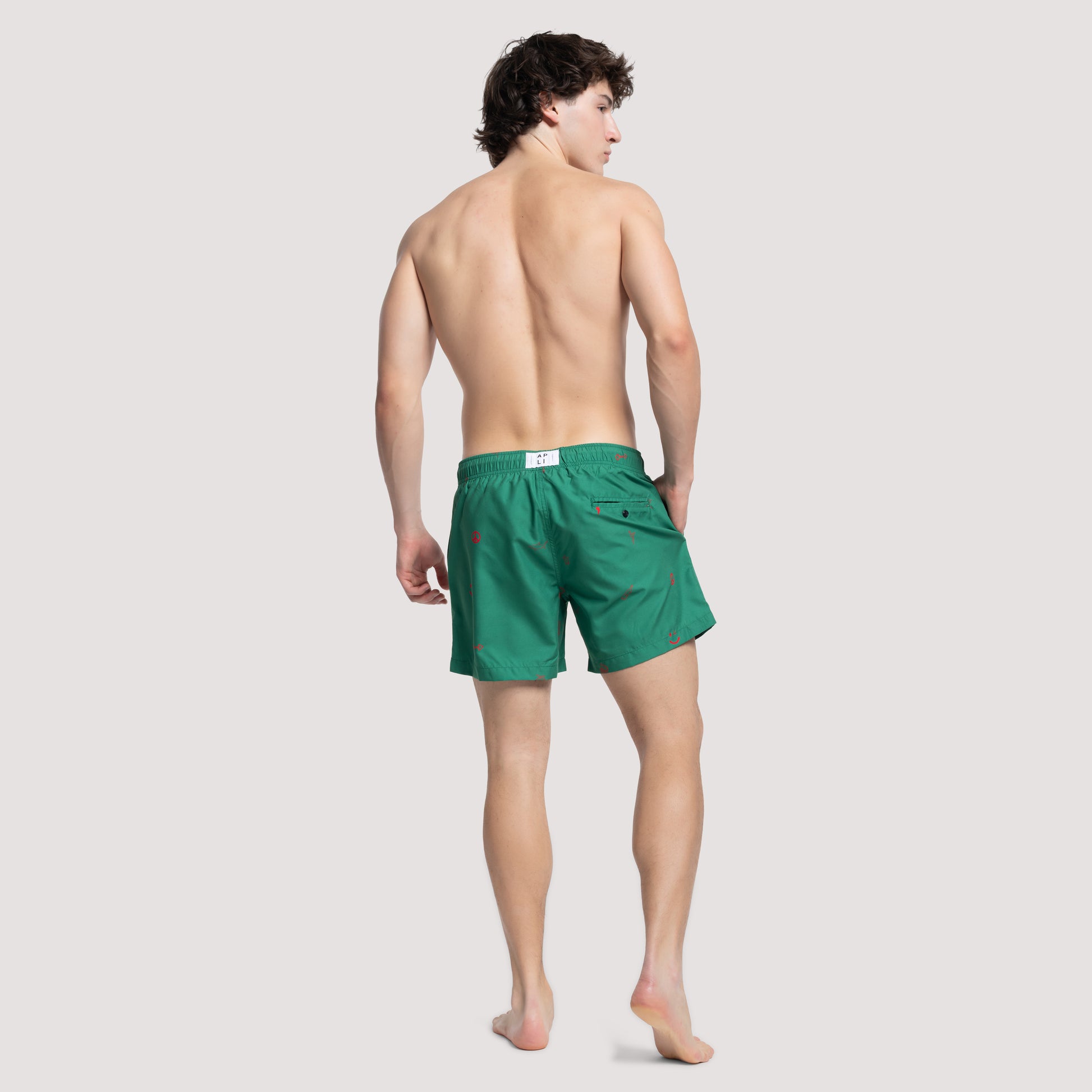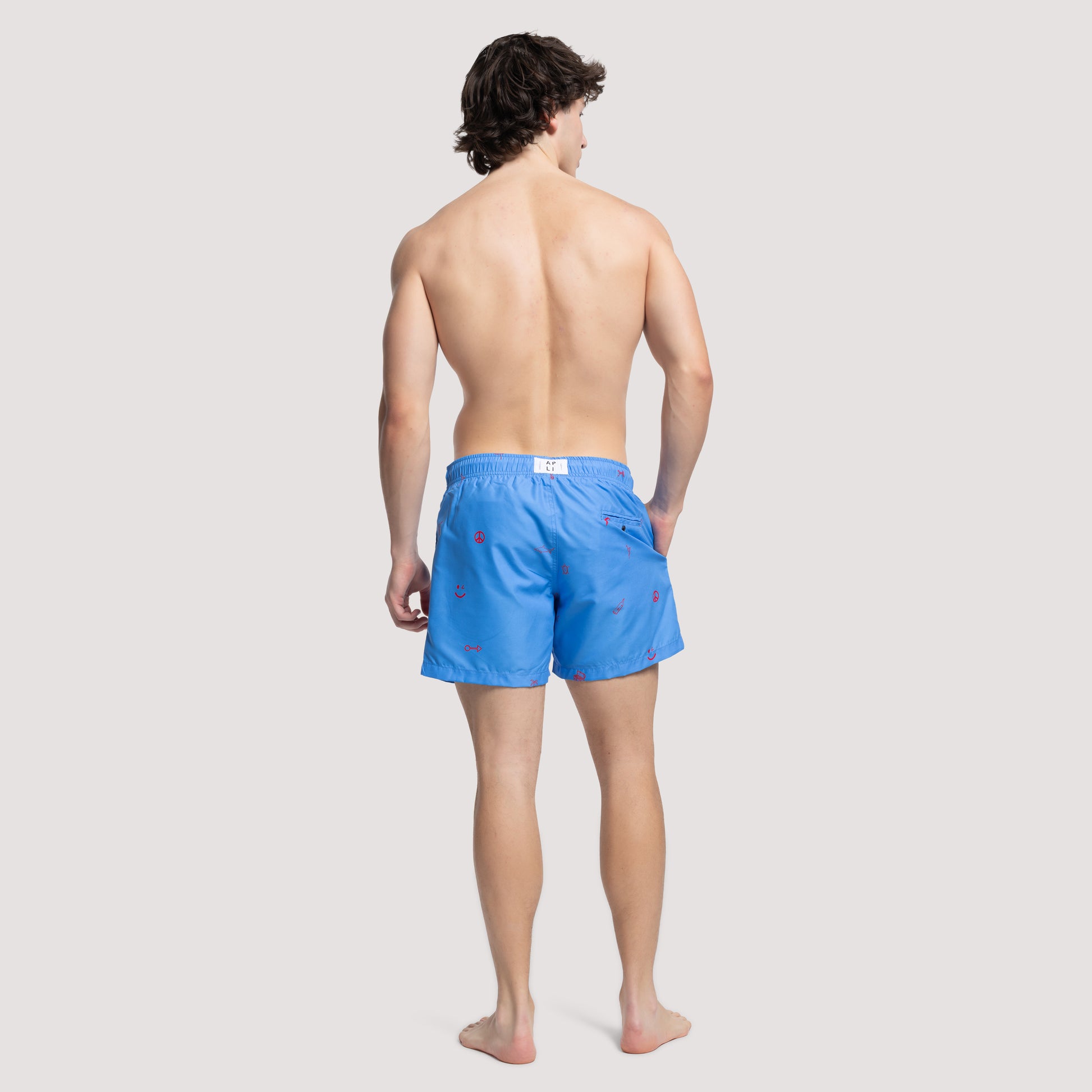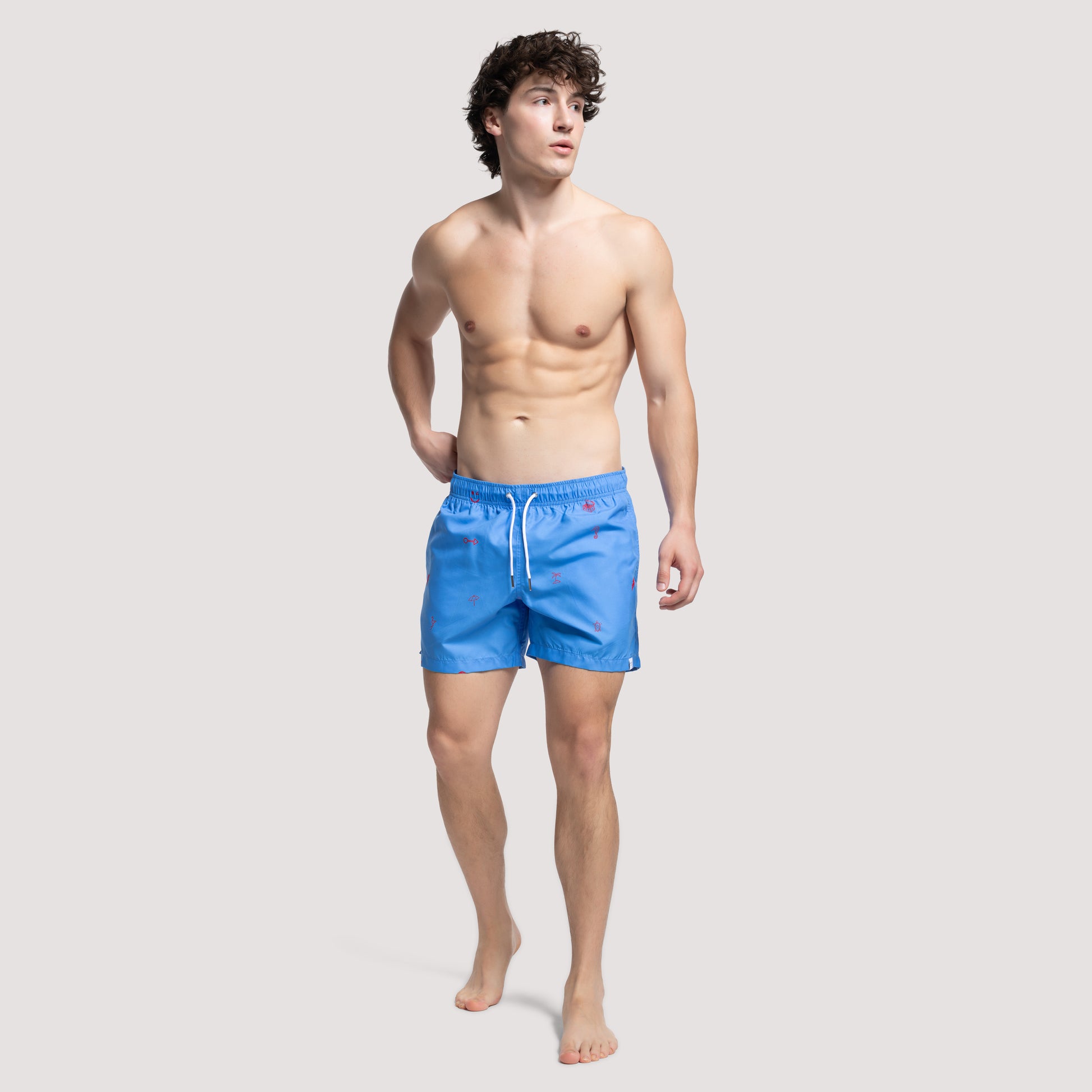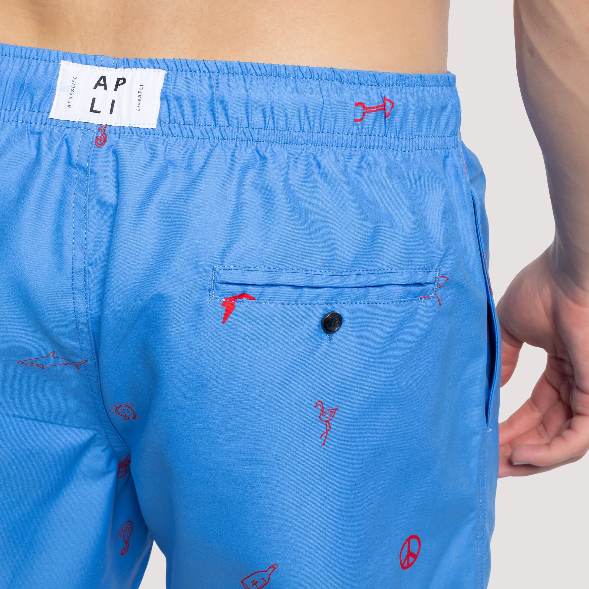 Swim shorts featuring icons, crafted from sustainable material in a regular fit. Designed with an elastic waistband and drawstrings for comfort, and equipped with three pockets for convenience. Detailed with a small logo application on the left leg and a medium logo on the back. Soft mesh lining ensures a comfortable fit. Constructed from 100% recycled polyester sourced from PET plastic bottles. Model stands at 185cm (6’1 ft) tall and wears size M.