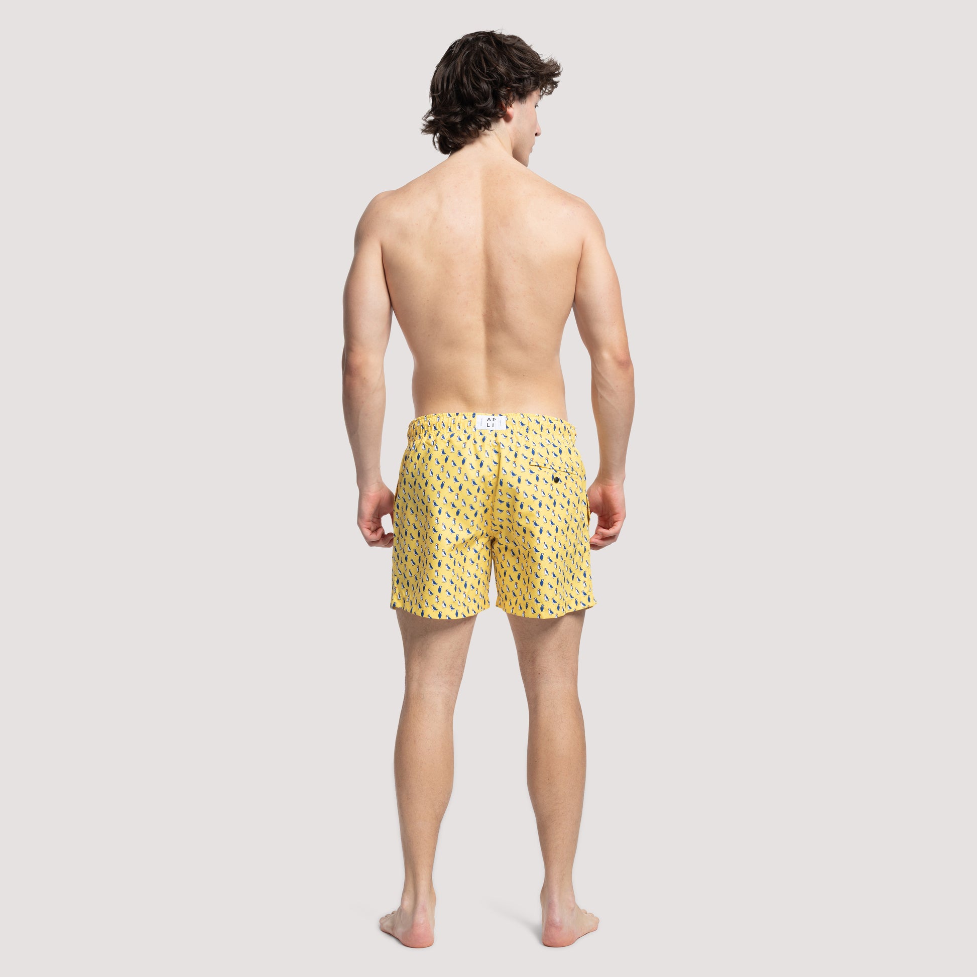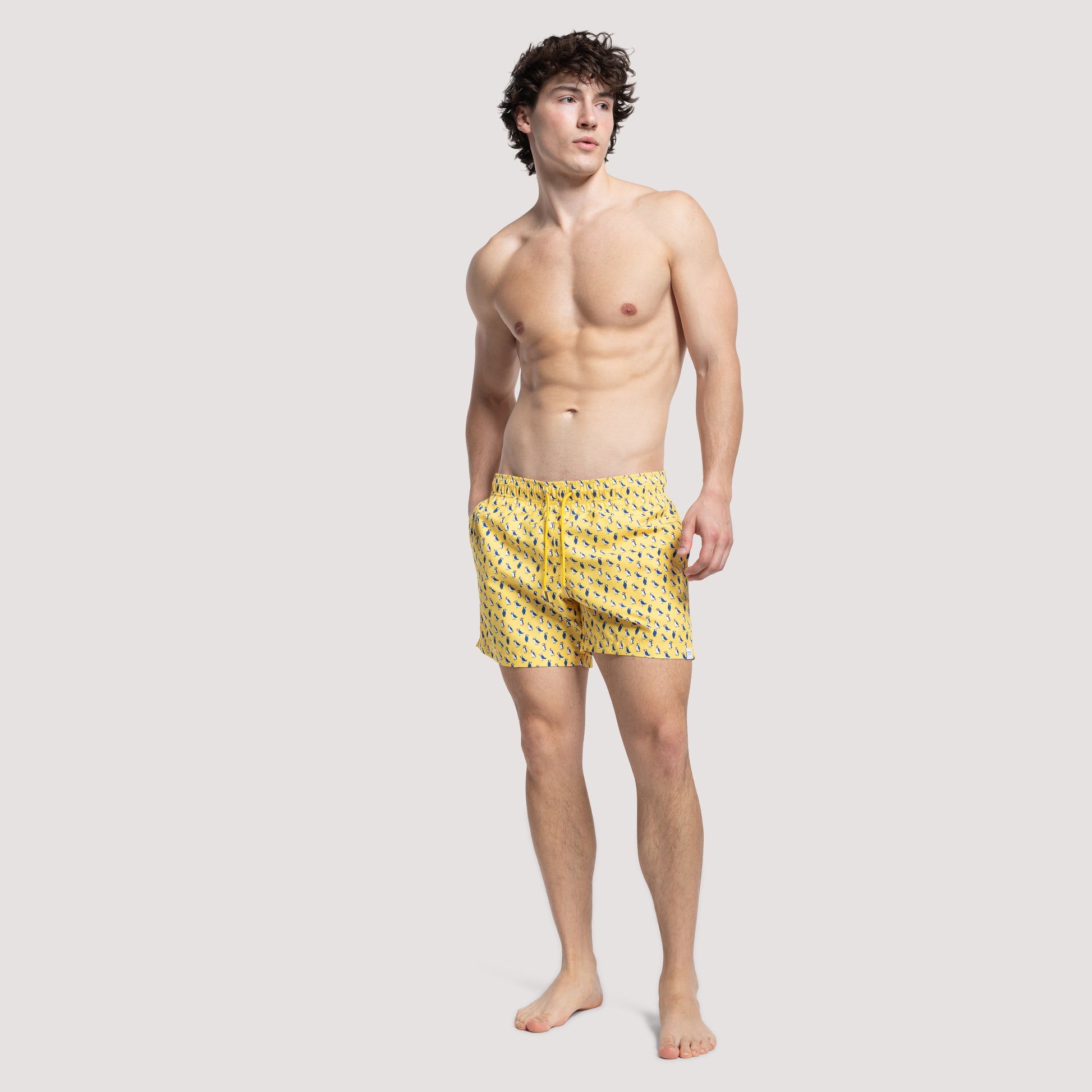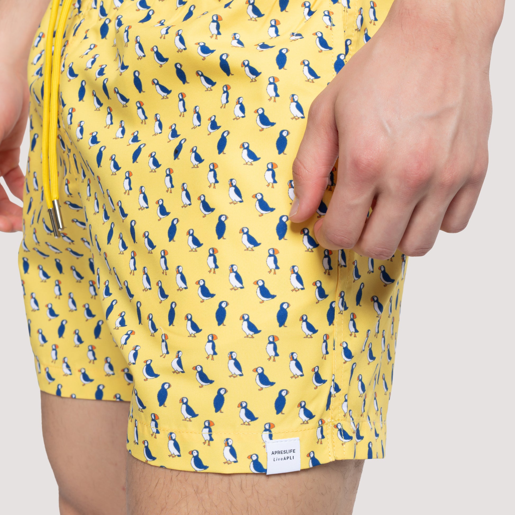 Yellow swim shorts featuring small puffin prints, designed in a regular fit with an elastic waistband and drawstrings. Equipped with three pockets for practicality, detailed with a small logo application on the left leg and a medium logo on the back. Soft mesh lining ensures a comfortable fit. Crafted from 100% recycled polyester derived from PET plastic bottles. Model stands at 185cm (6’1 ft) tall and wears size M.