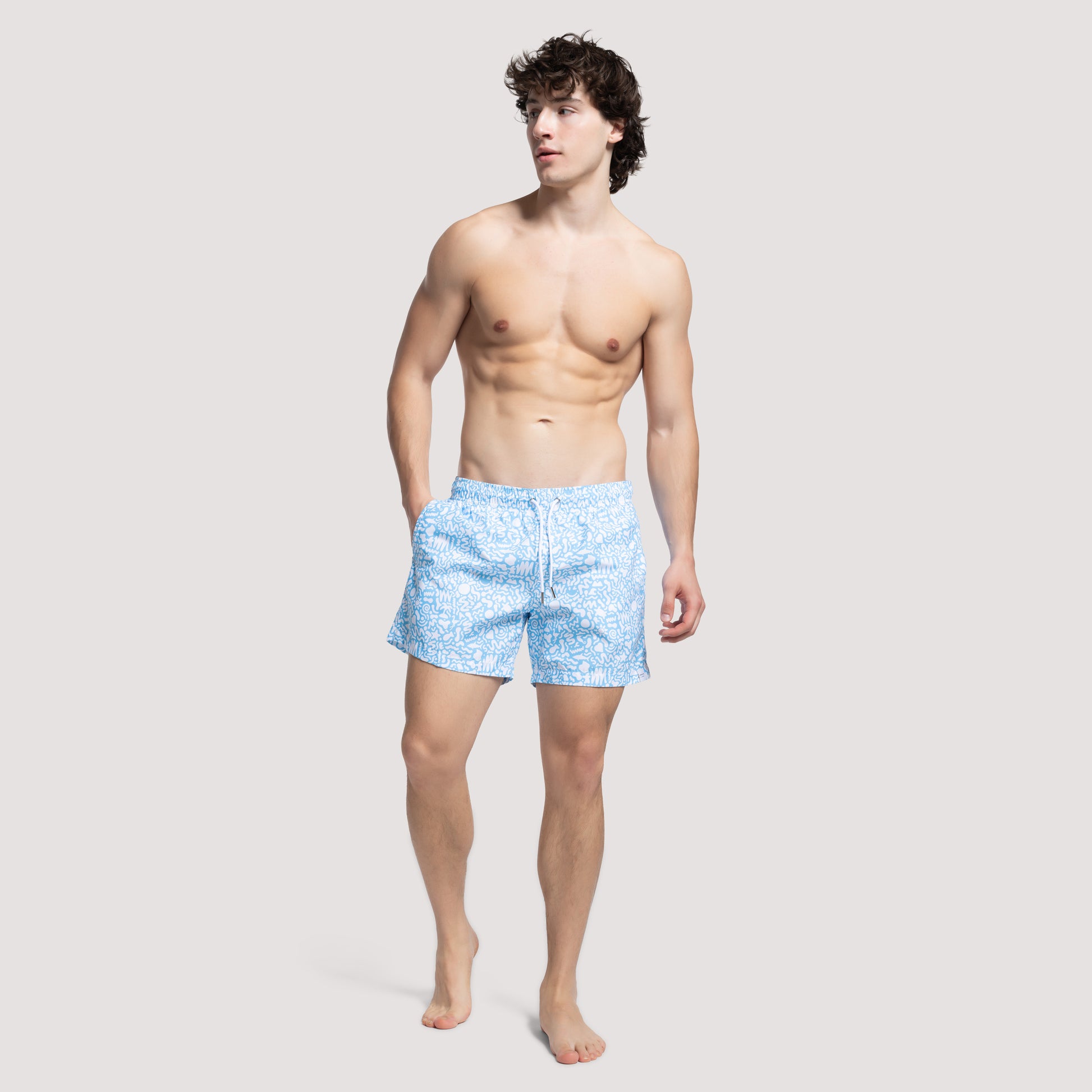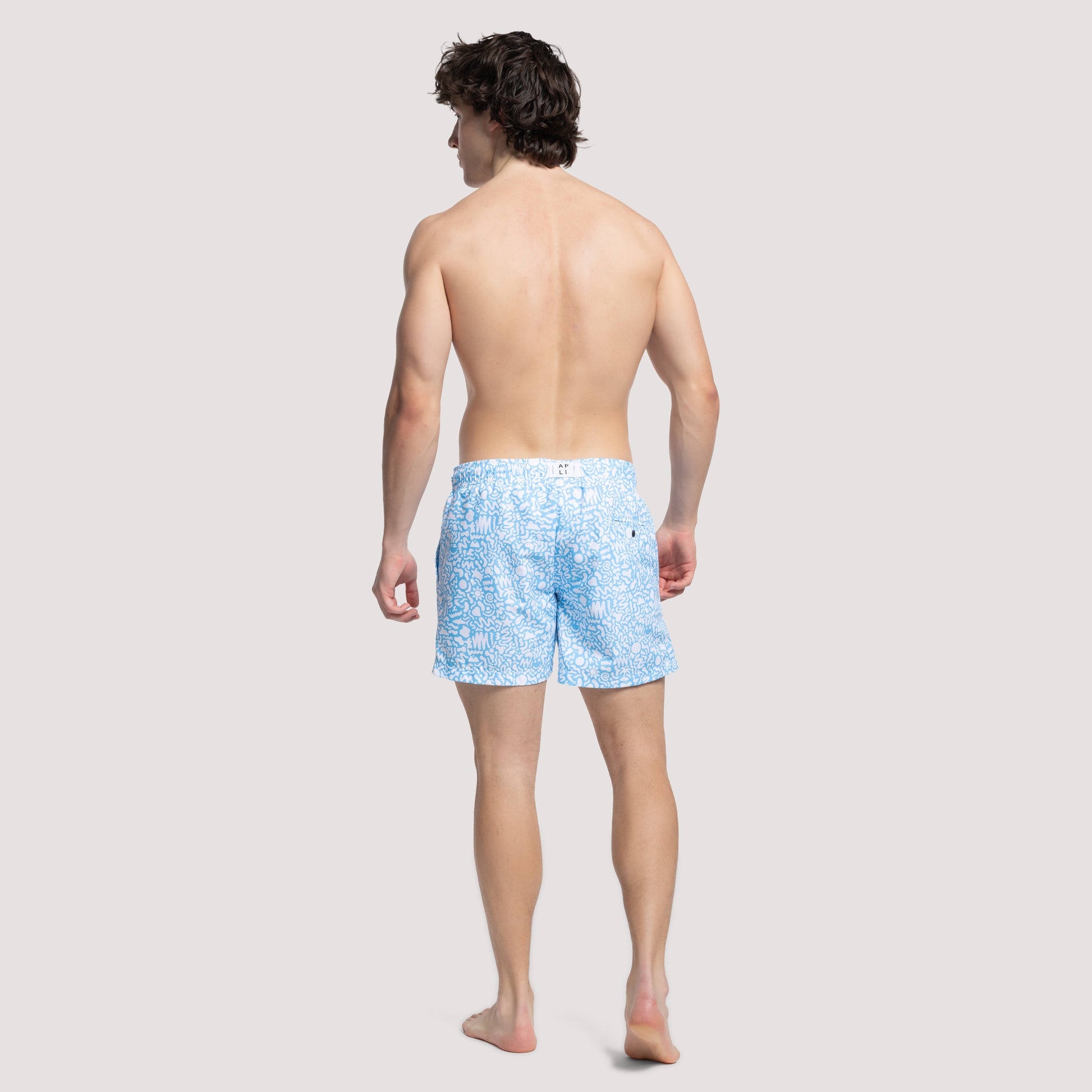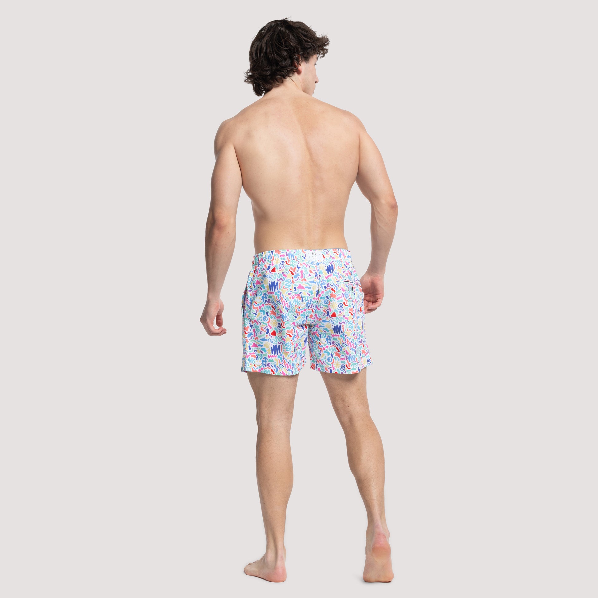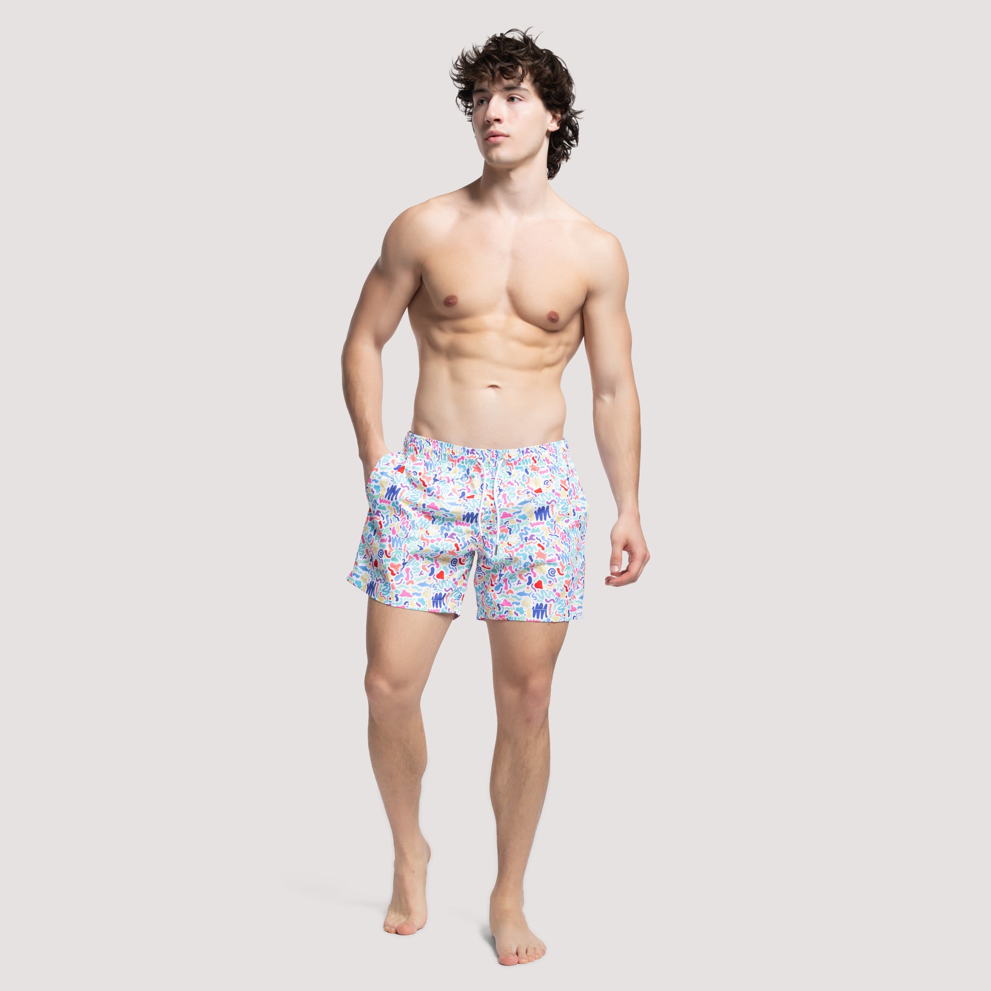Colorful swim shorts designed in a regular fit with an elastic waistband featuring drawstrings and three pockets. Adorned with a small logo on the left leg and a medium logo on the back. Soft mesh lining ensures a comfortable fit. Crafted from 100% recycled polyester sourced from PET plastic bottles. Model stands at 185cm (6’1 ft) tall and wears size M.