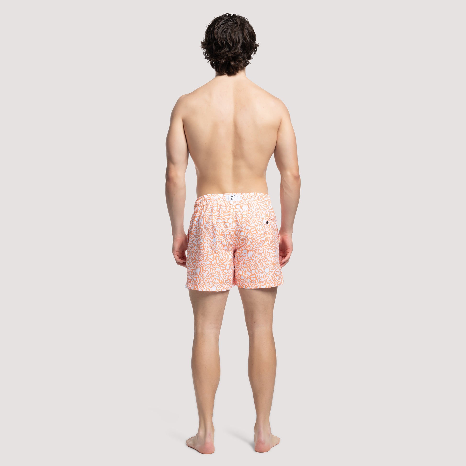 Orange swim shorts designed in a regular fit with an elastic waistband featuring drawstrings and three pockets. Soft mesh interior lining ensures a comfortable fit. Adorned with a small logo on the left leg and a medium logo on the back. Crafted from 100% recycled polyester sourced from PET plastic bottles. Model stands at 185cm (6’1 ft) tall and wears size L.